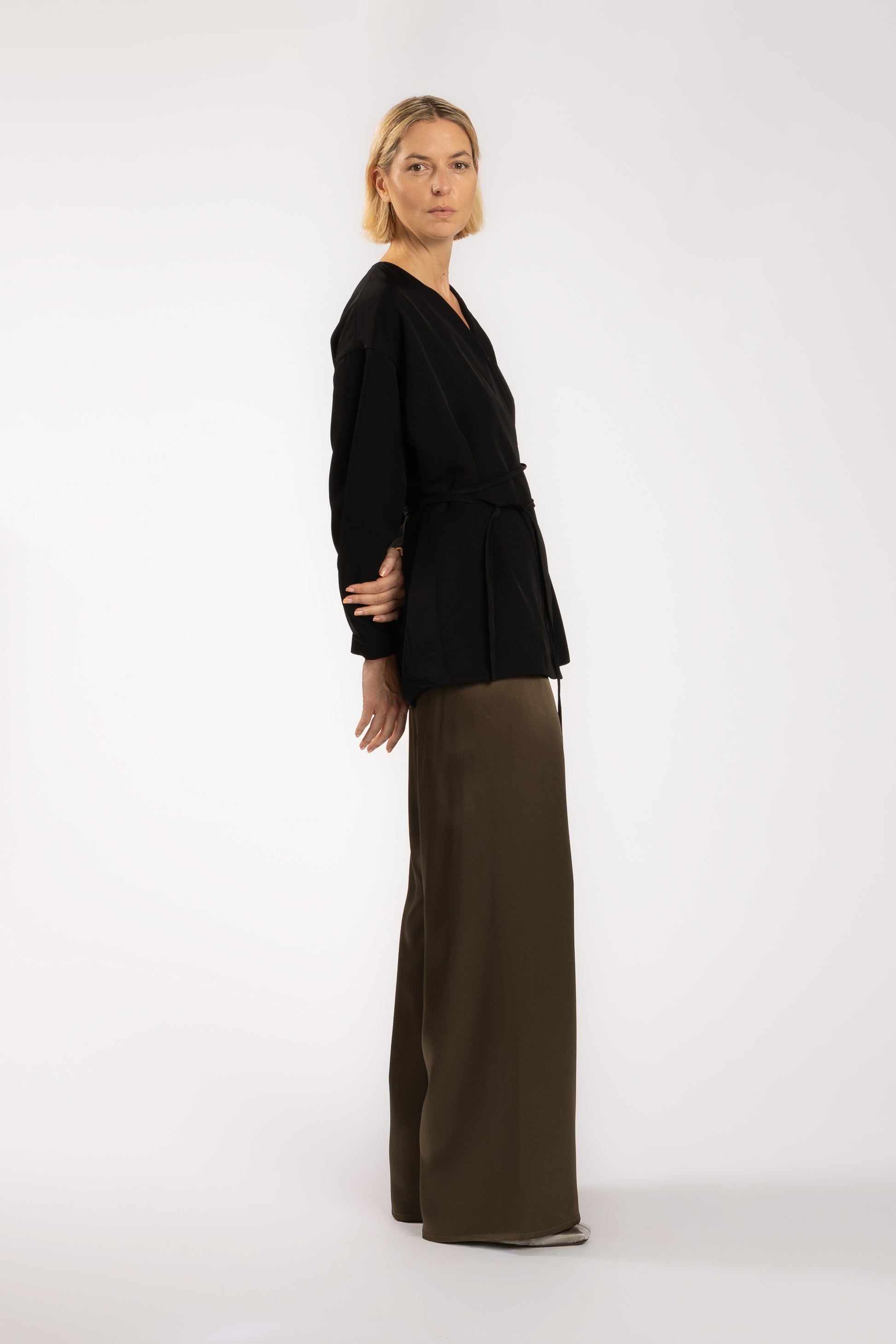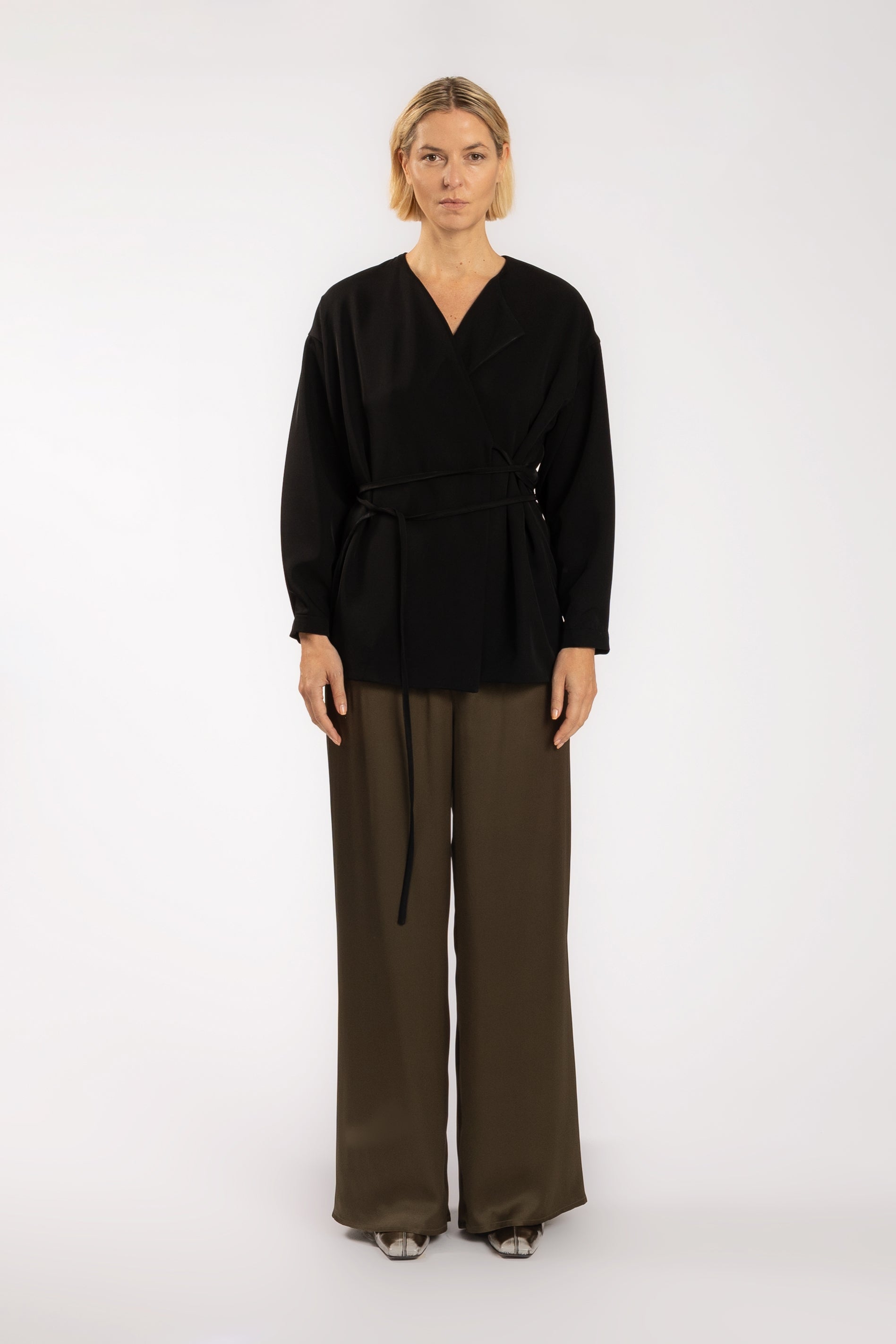 A relaxed wrap jacket with a soft, sculptural silhouette. Designed with dropped shoulders, a deep V-neckline and a fluid belt that wraps around the waist to adjust the shape.