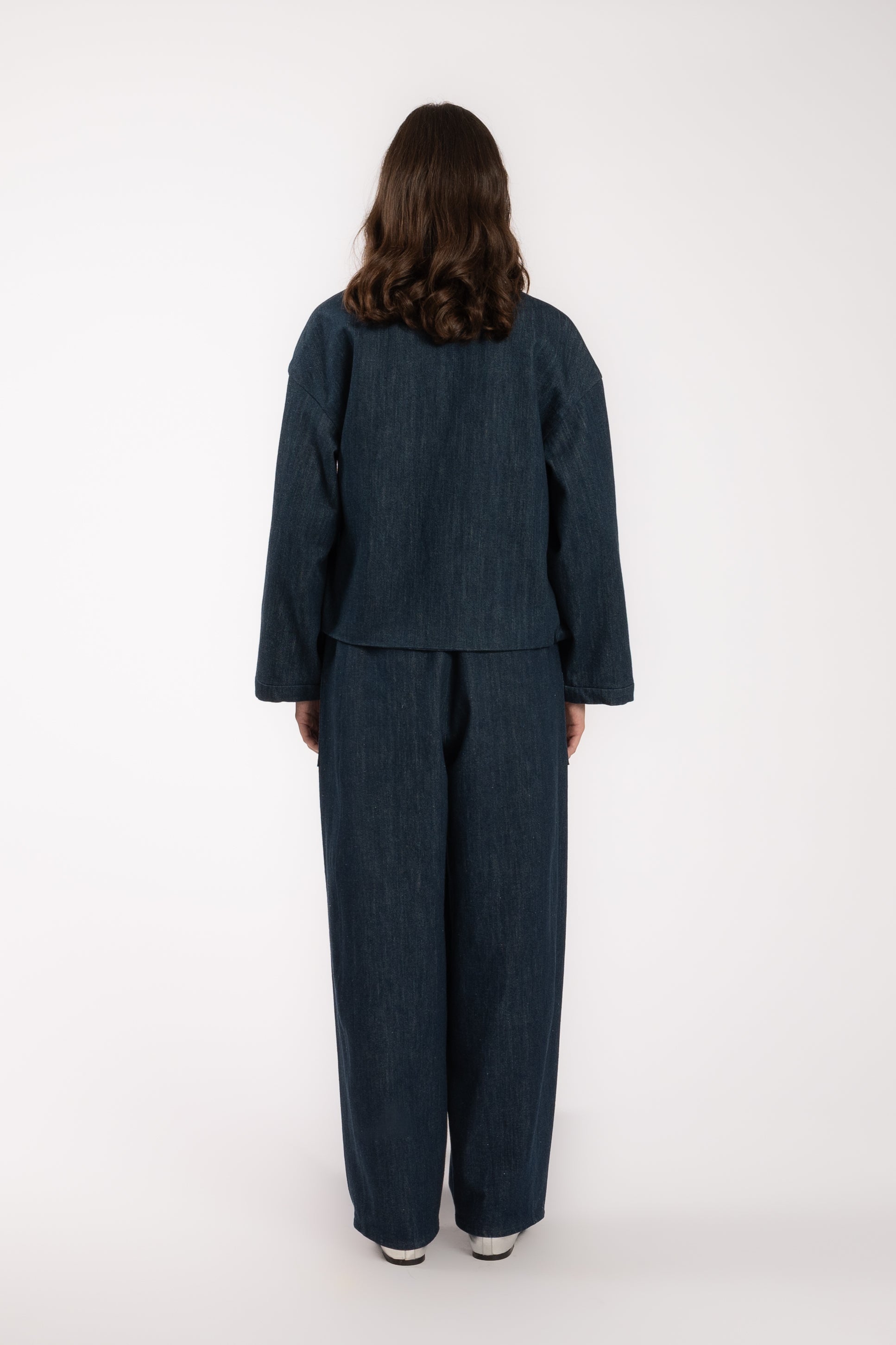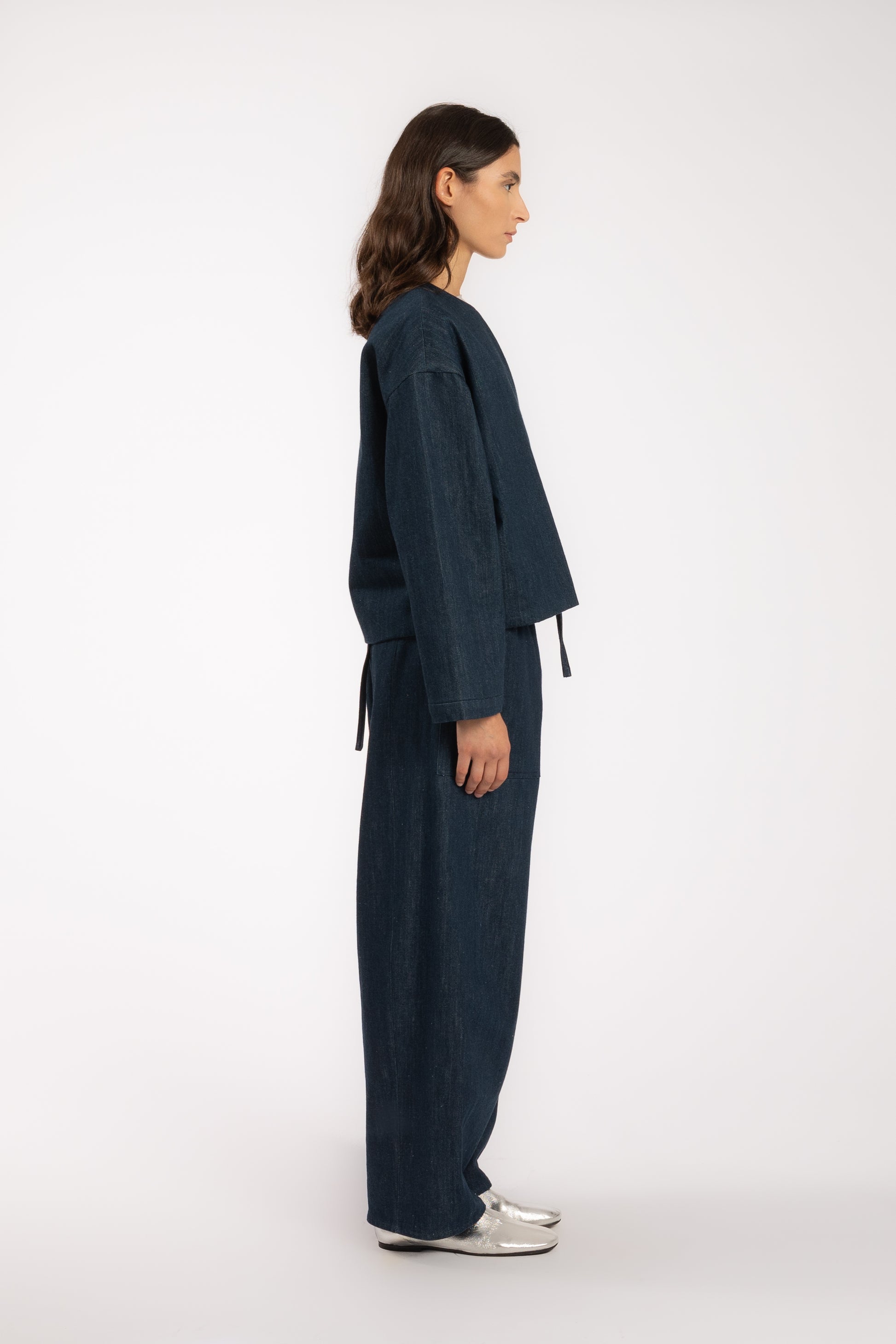 Made from sturdy cotton denim, it features long wrap ties that allow the neckline to be styled two ways — closed for a round neck or open for a deeper V-shape.