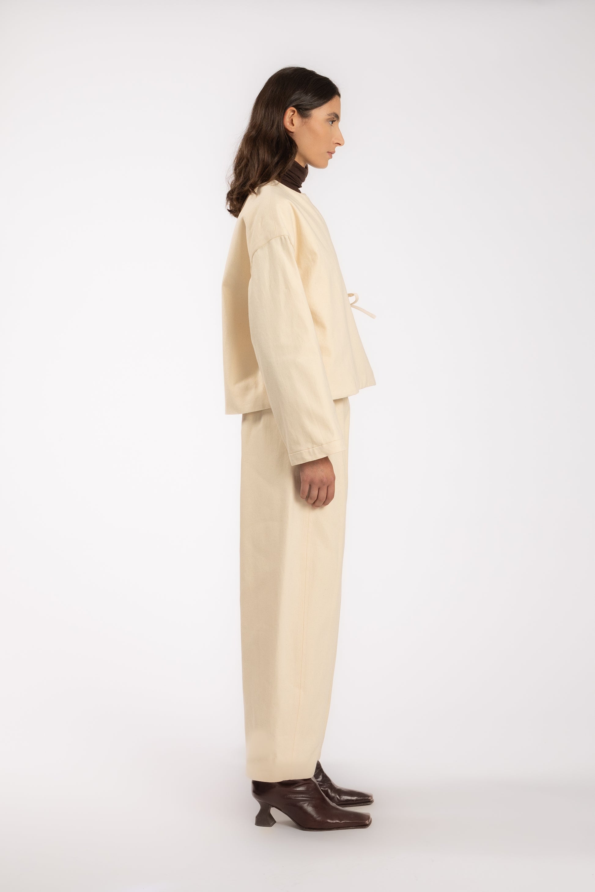 The Java Jacket is a structured wrap-style piece with a clean, minimal silhouette.